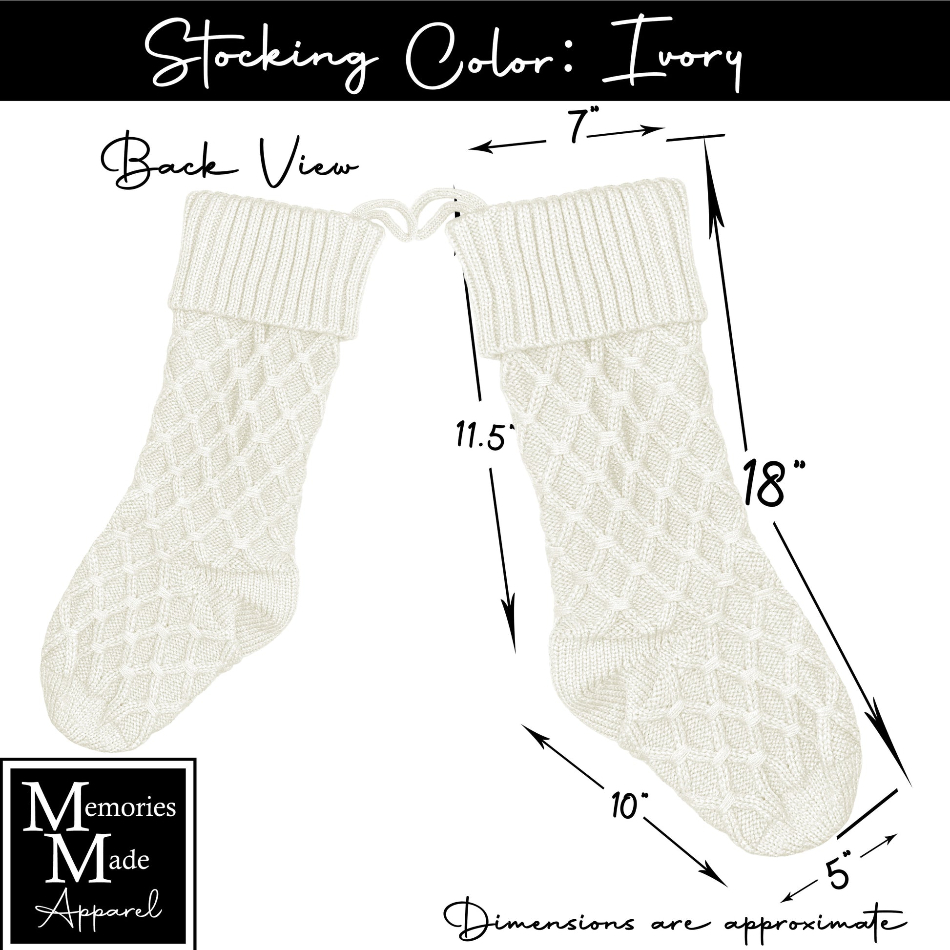If you have ordered from Memories Made Apparel before, please note that the font chart has changed. Your old design files are stored. Please mention in your order notes that you would like your stocking to match your previous order and provide order # if possible. If your name has changed, please also list your previous name so your old files can be located.